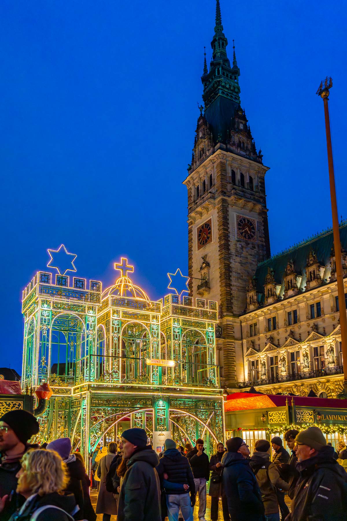 The backdrop is hard to beat, with Hamburg City Hall towering over the market and making the whole setup feel extra impressive.