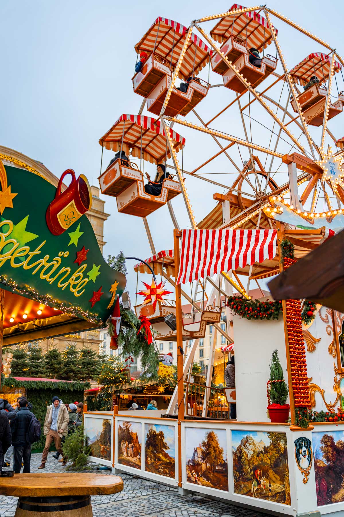 There’s also a giant Christmas pyramid, a twinkling Ferris wheel, and plenty of cozy spots to sip Glühwein while taking in the view.