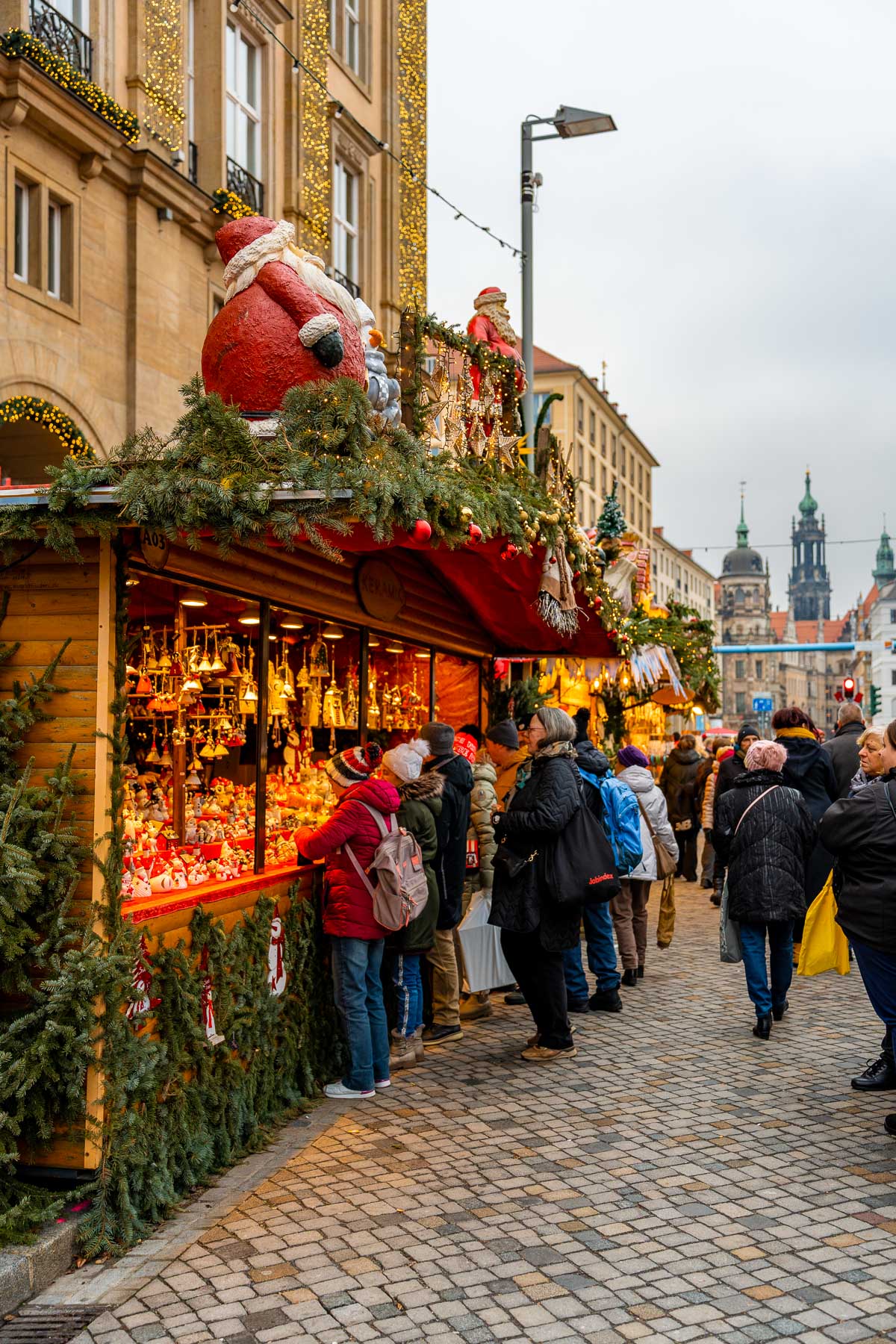 Just around the corner, the Münzgasse market stretches toward the Elbe River and is known for its eight-meter-tall wooden pyramid decorated with carved figures. Santa stops by every afternoon at 4 pm with small surprises for children.